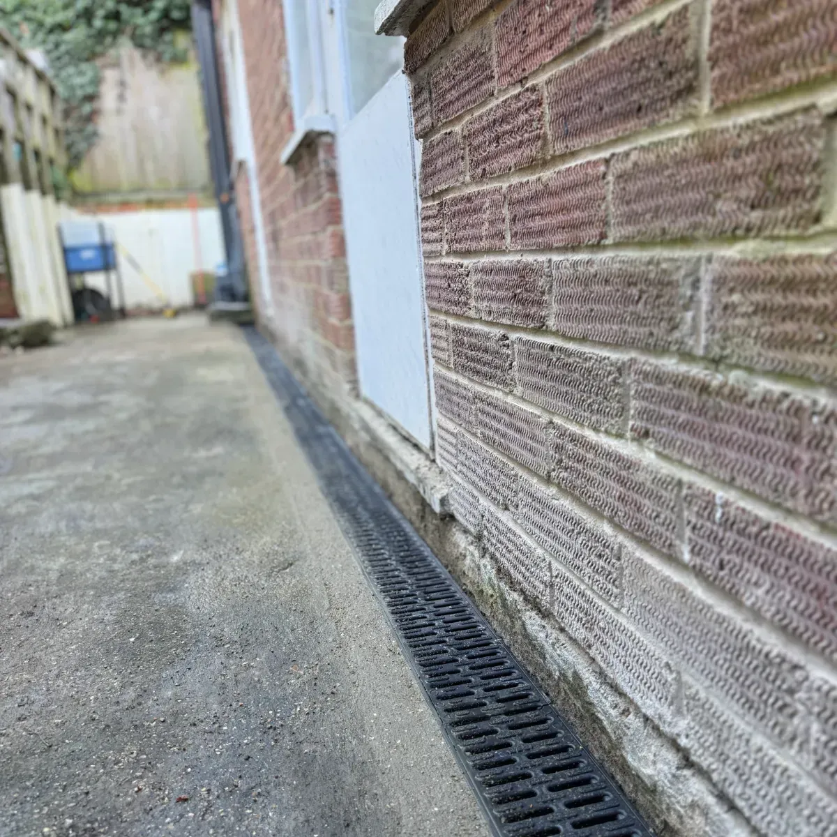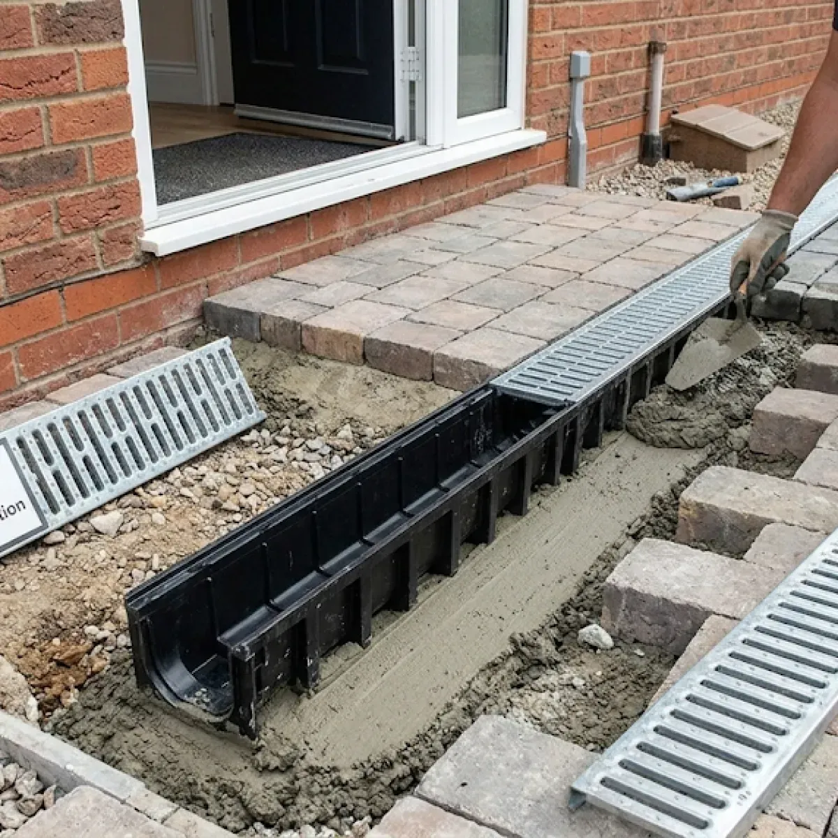 Professional linear drainage for driveways, patios, and garage thresholds to handle heavy rainfall.